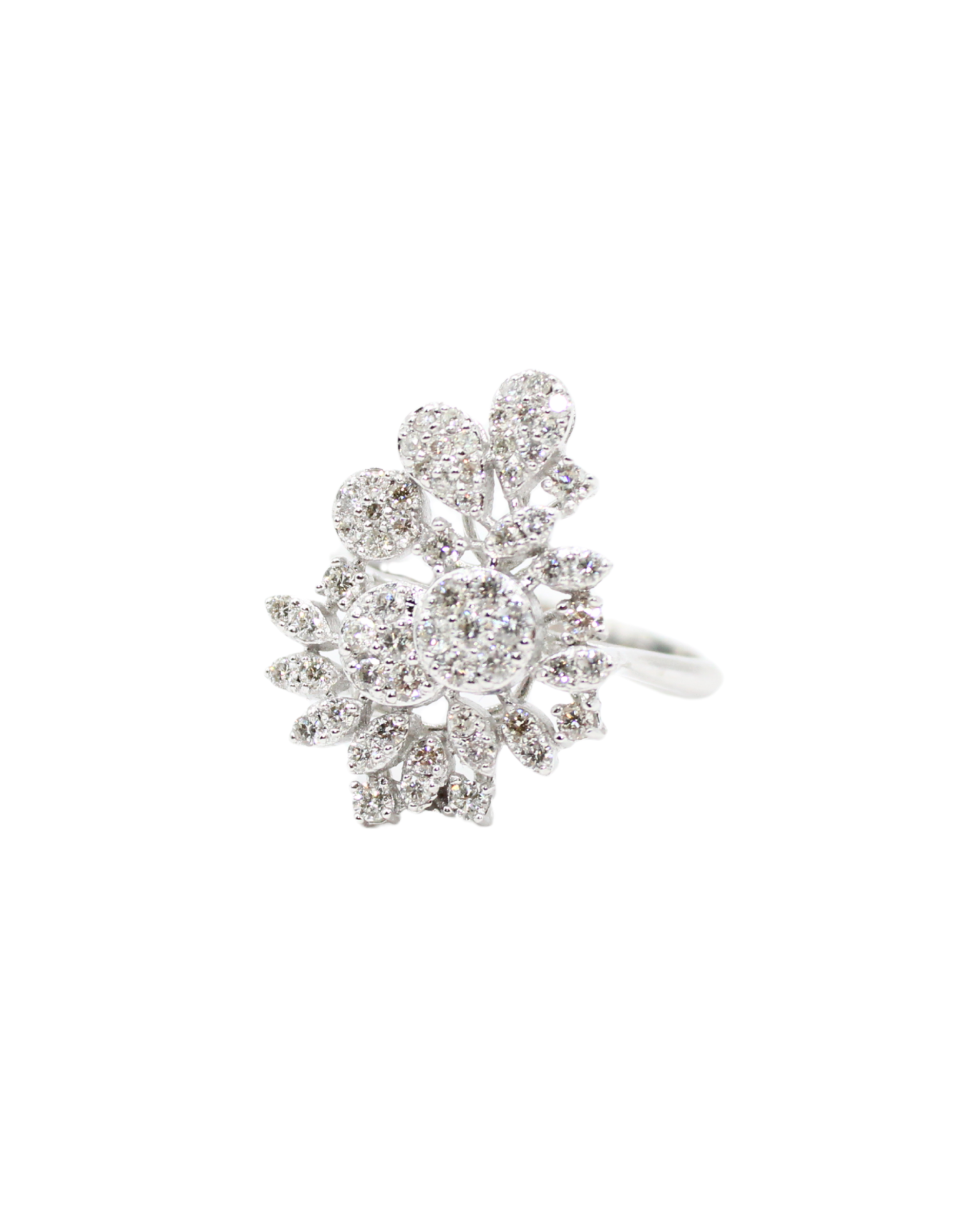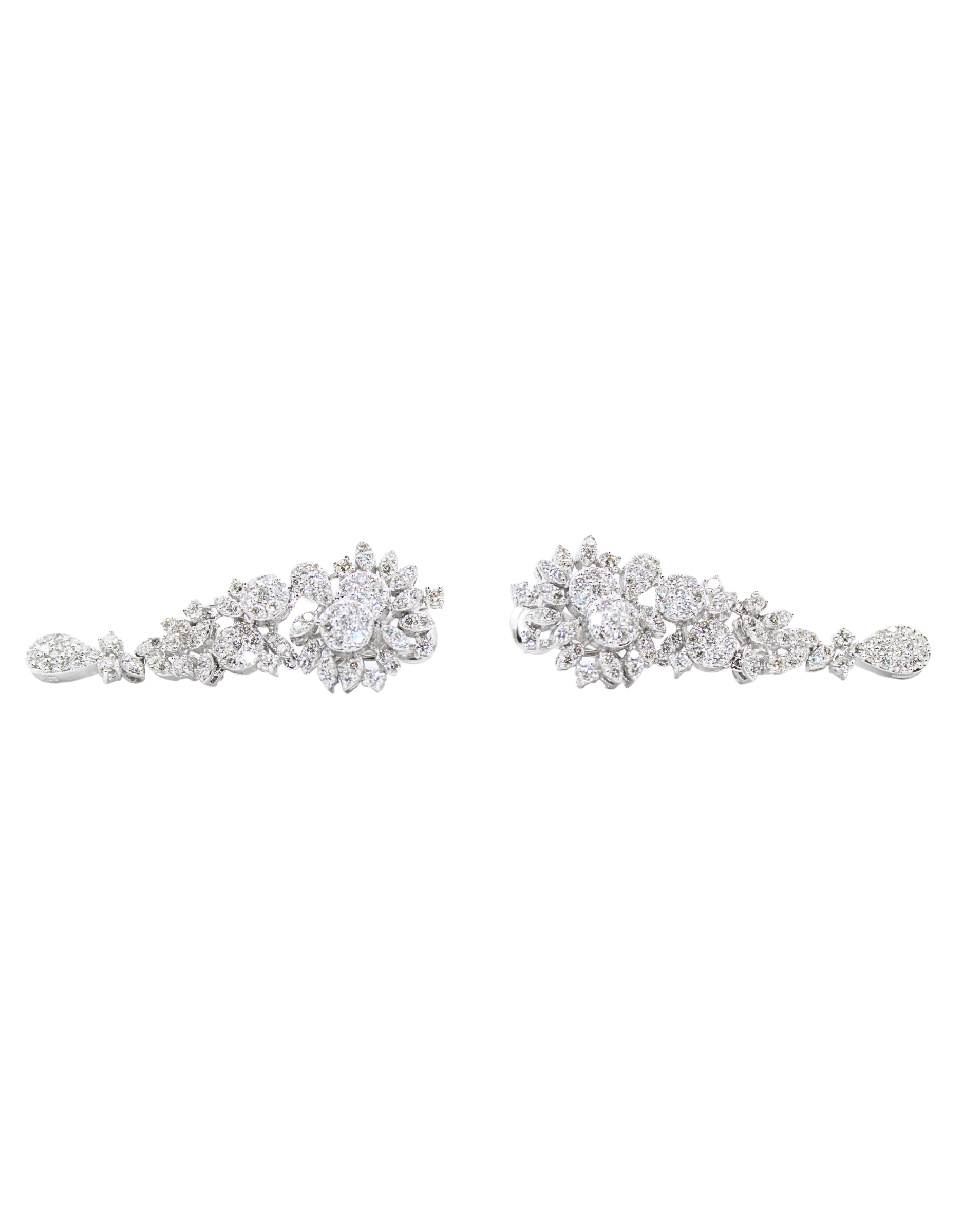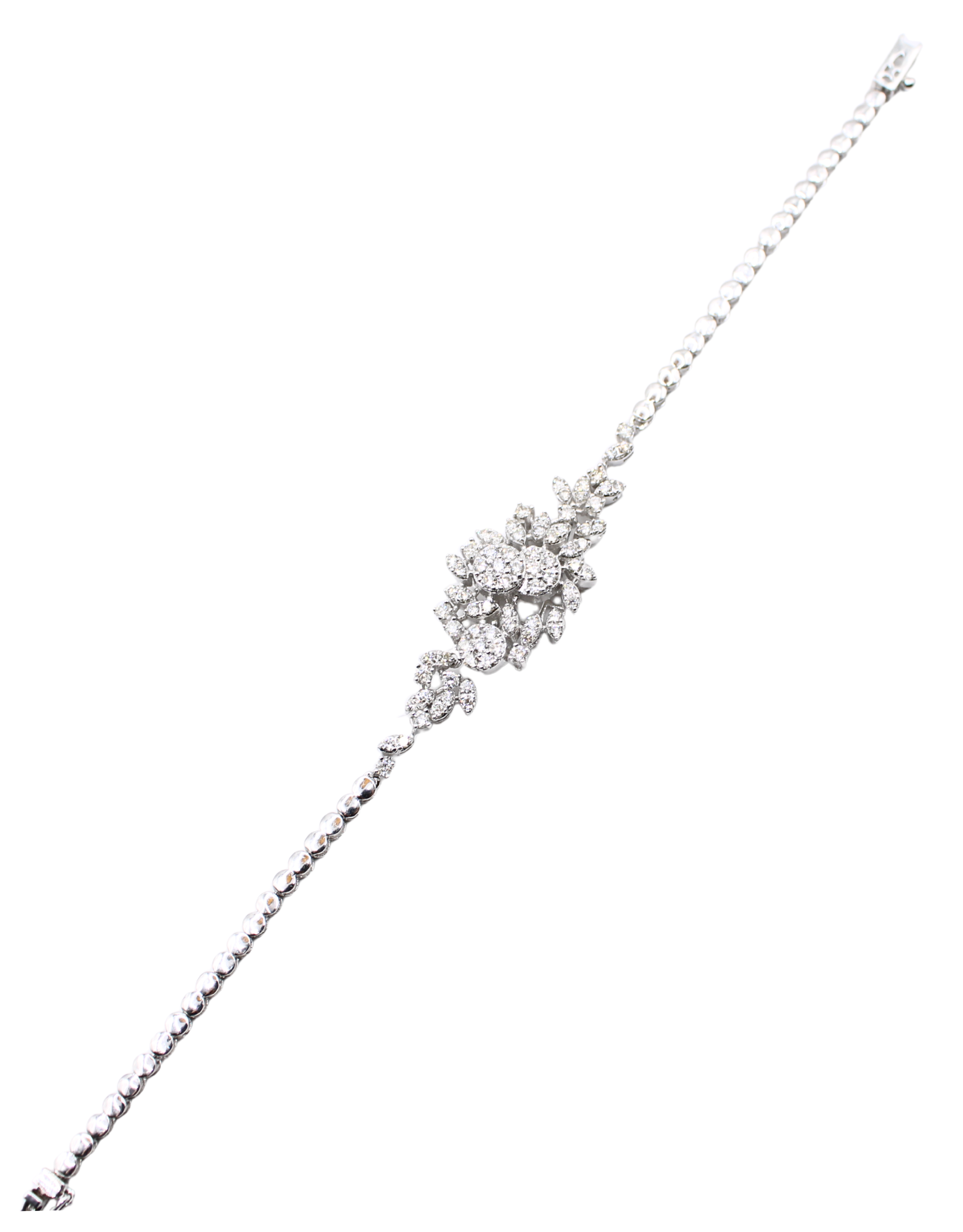 Ağ qızıl üzərində zərif çiçək formasında klassik boyunbağı, qar ağ brilliant kəsimli və baqet kəsimli brilliantlarla bəzədilmişdir.