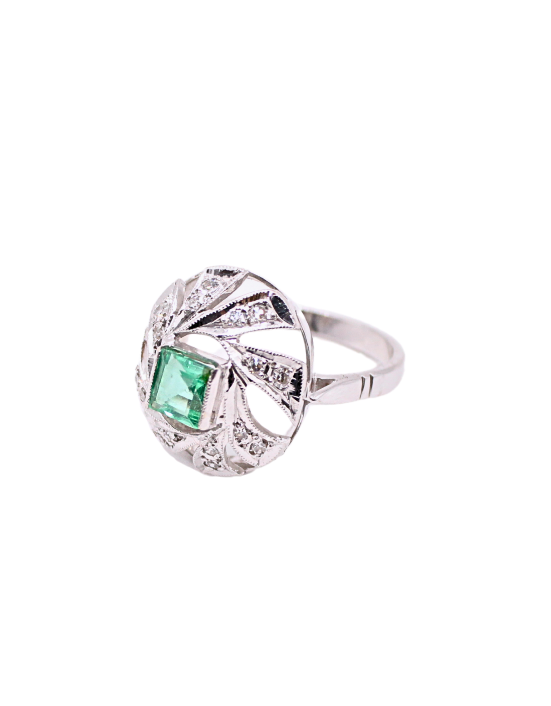 Ağ qızılda zümrüd və brilyantlarla dəbdəli üzük.