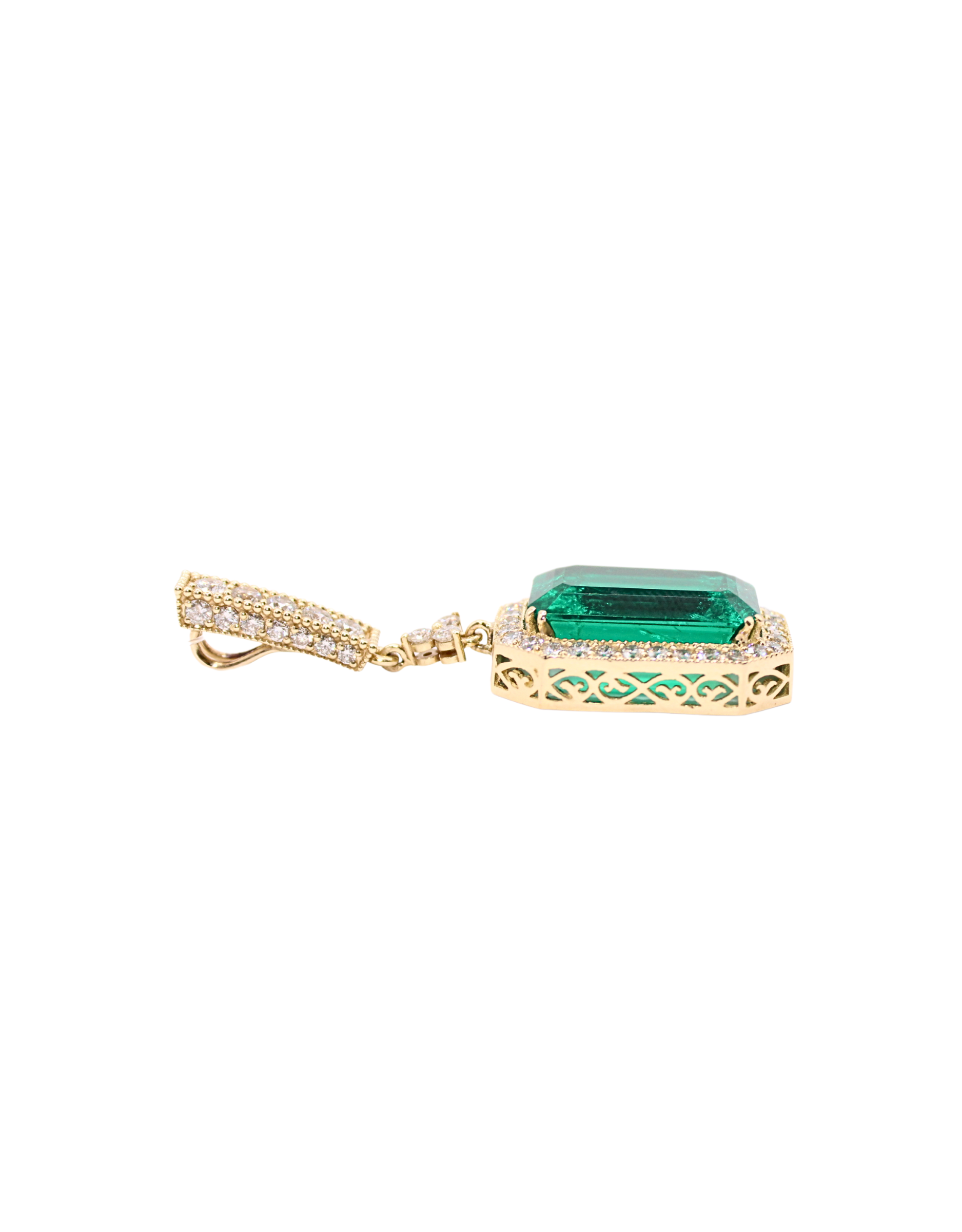 Qızıldan hazırlanmış, brilyantlar və bir böyük yaşıl sintetik daşla bəzədilmiş kulon.