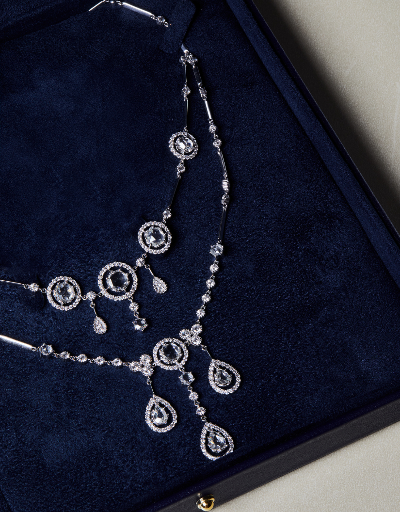 Parıldayan ağ qızıldan hazırlanmış, brilyantlarla bəzədilmiş boyunbağ