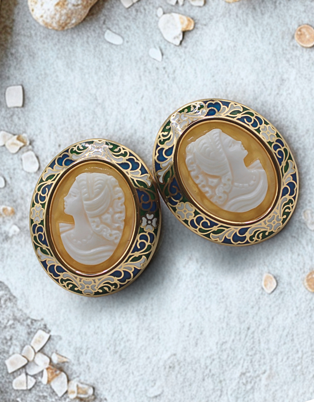 Cameo sırğalar, zərif zəriflik və tarixi dərinliyin təcəssümüdür. Hər bir cameo, inanılmaz dəqiqliklə oyulmuş, sırğaları klassika və zərifliyin birləşdiyi həqiqi bir sənət əsərinə çevirir.