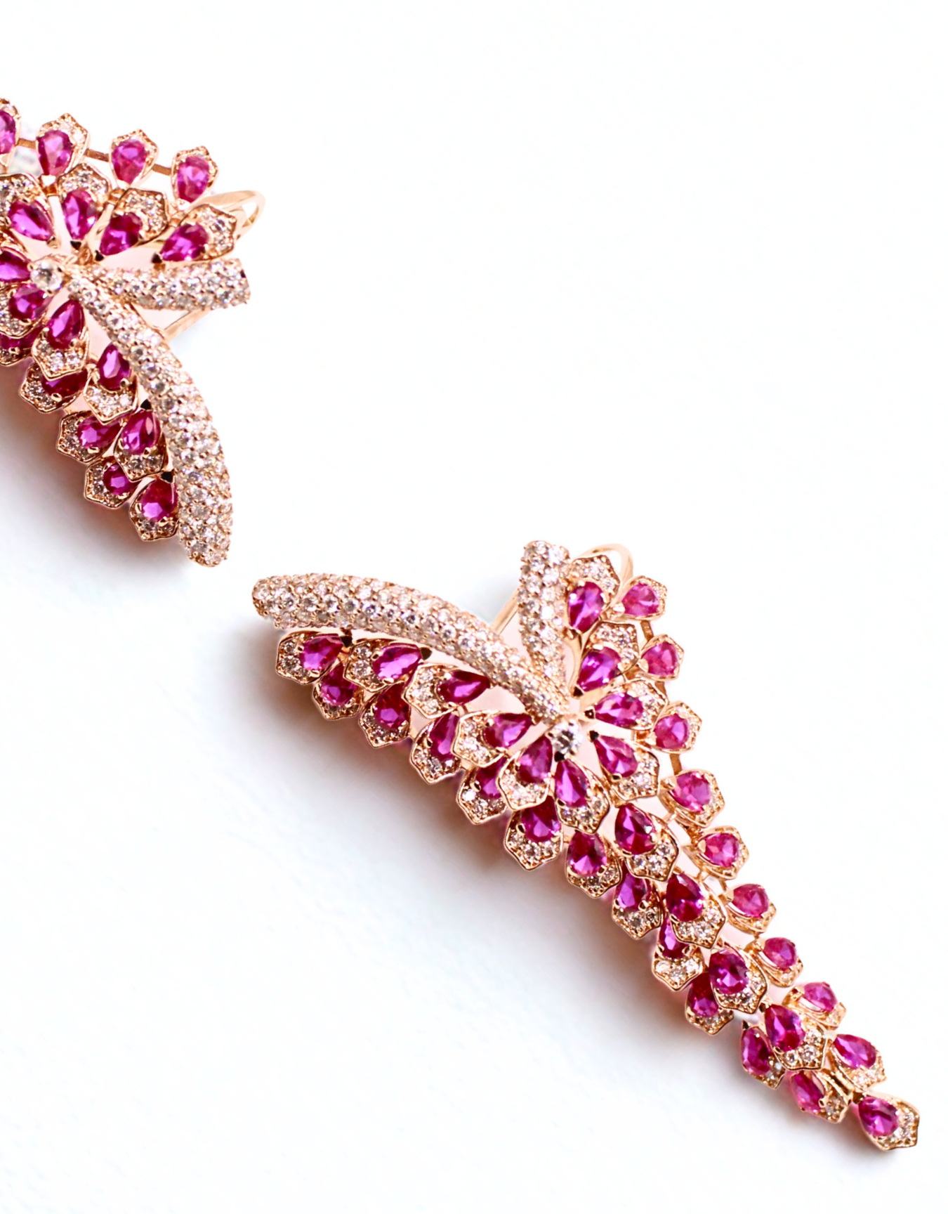 Золотые серьги с бриллиантами и темно-розовыми корундами.