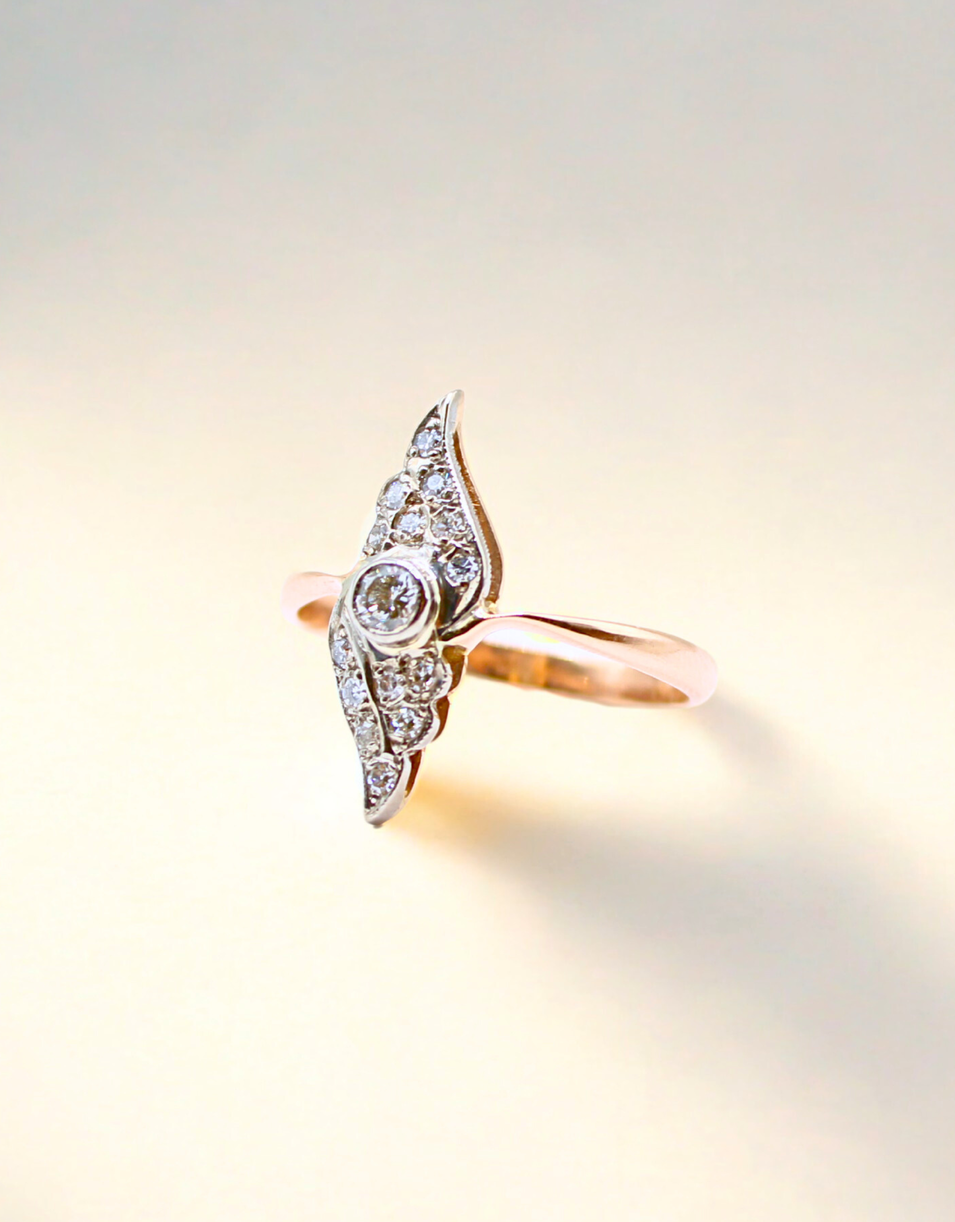 Кольцо на комбинированном золоте инкрустированное старинными бриллиантами напоминающее переплетение крыльев-символа свободы и легкости.