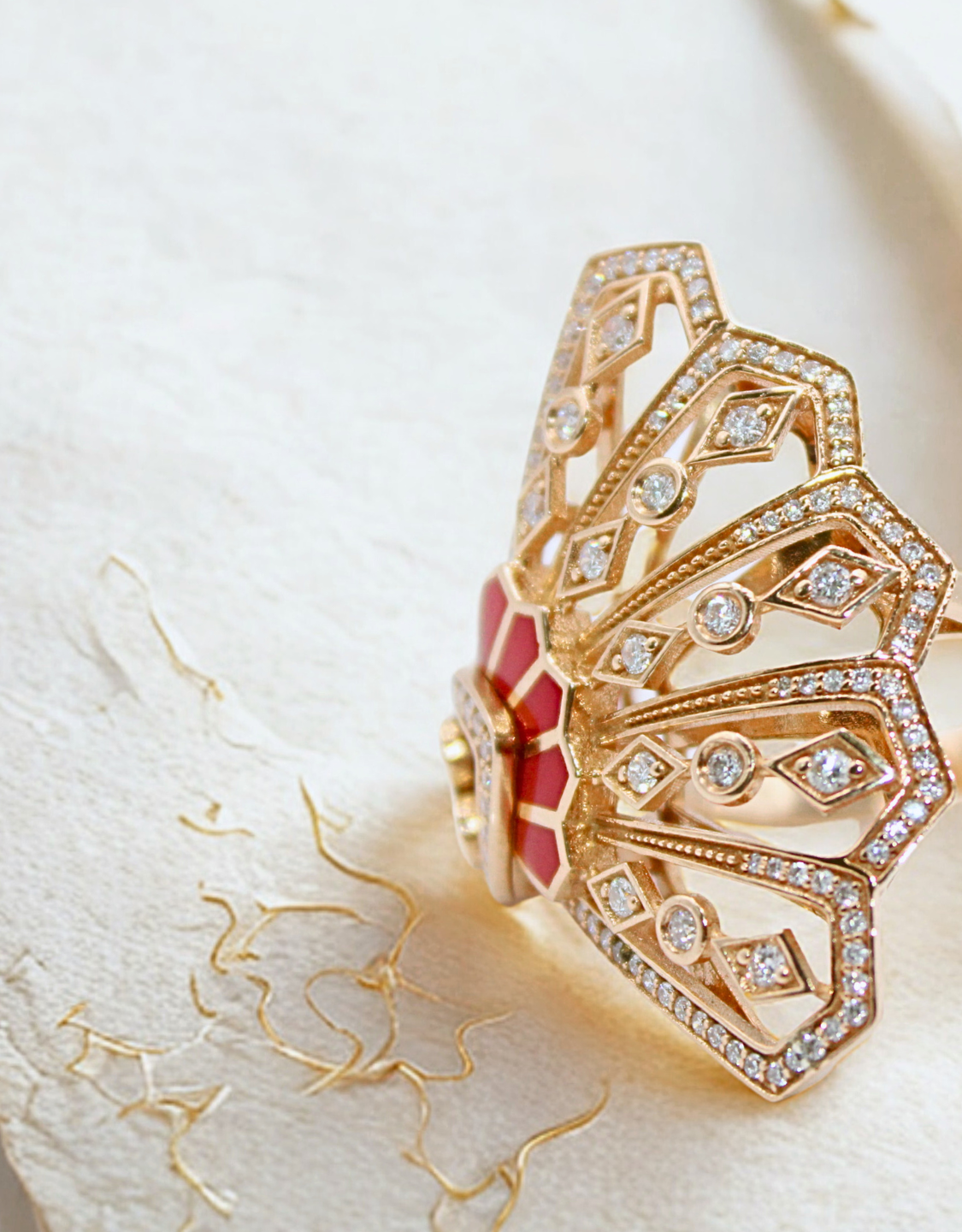 Авангардное крупное кольцо, усыпанное бриллиантами и украшенное яркими деталями из эмали. Кольцо можно носить и самостоятельно, а также в комплекте.
