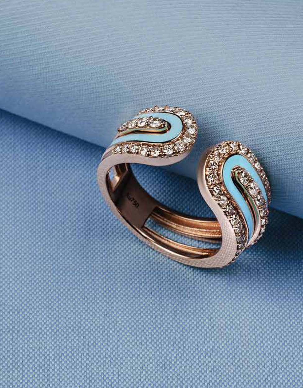 Кольцо из розового золота с бриллиантами и бирюзовой эмалью.