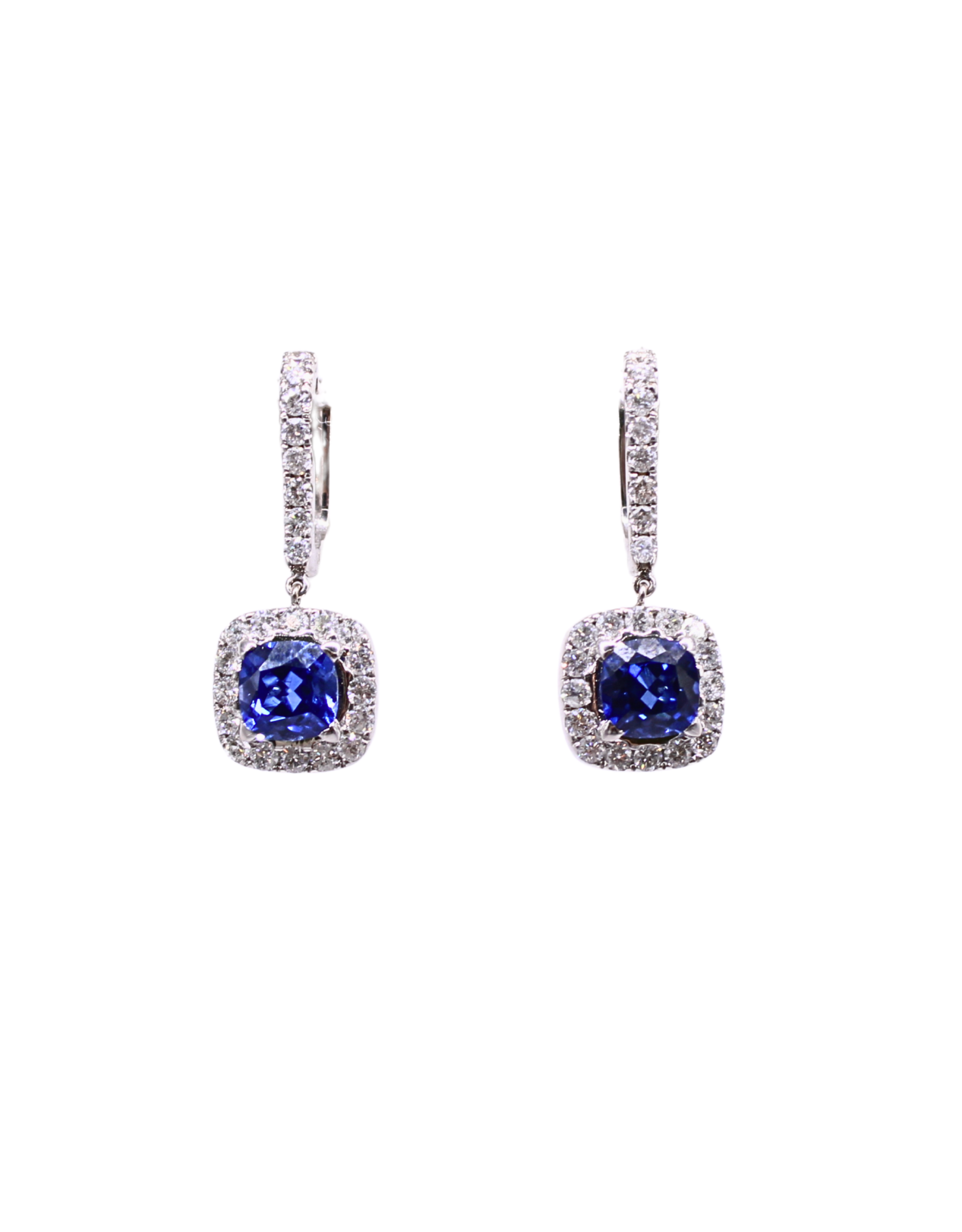 Кольцо из белого золота, украшенное бриллиантами, с синим корундом в центре.